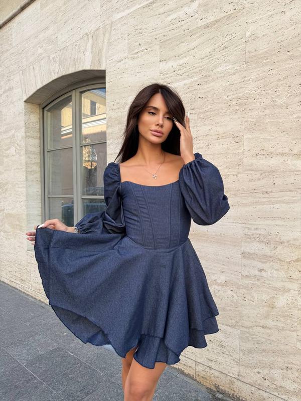 Модель 361 новинка Платье с изысканным корсетным лифом, изящно подчеркивающее талию и создающее женственный силуэт. Эффектная шнуровка на спинке добавляет нотку романтичной утонченности, а объемные рукава придают образу легкость и легкость. Тканина: джинс раз) Размеры: S, M, L Цвета: темный джинс, синий, голубой Замеры на модель 361 Длина от талии: S- 40 см M- 40 cm L - 40 cm Ширина по груди регулируется шнуровкой: S- 74 cm M - 78 cm L - 84 cm Ширина по талии: S - 63см M-67 cm L - 71 см Ширина по бедрам - свободно Длина рукава 69 см