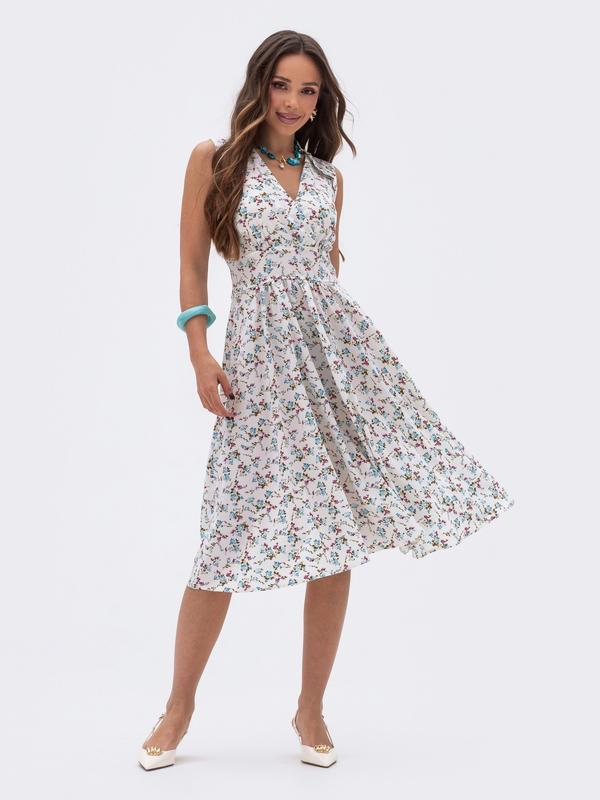 Расклешенное платье из принтованного софта. С лифом на запах и резинкой по горловине. Изделие с широким втачным поясом, с резинкой по спинке. Без застежек. арт 32666/2