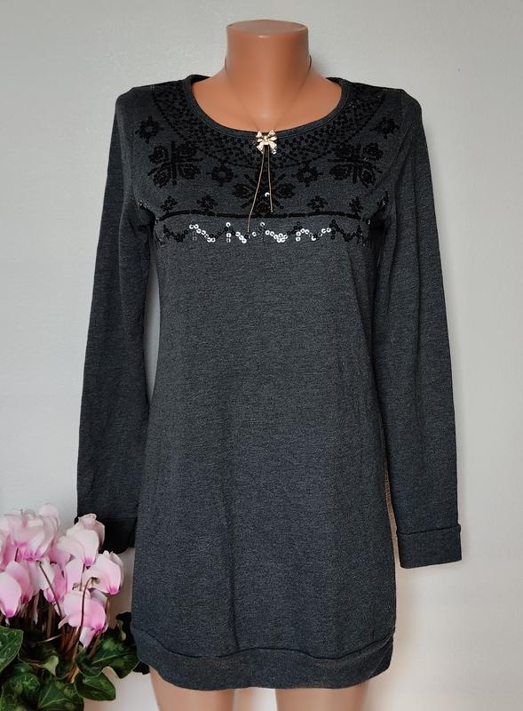 Классное платье туника, спереди украшенное пайетками. Ткань немного с начесом. Стан в целом великолепен, есть немного микрокотиков, не критично. Замеры: длина 78 рукав 63 пог 44-50 пот 42 -48 пост 45-52 низ 46-54