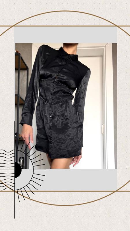 Міні атлас чорна сукня корсет сорочка рукав коротке плаття сатин ґудзики комір oldmoney