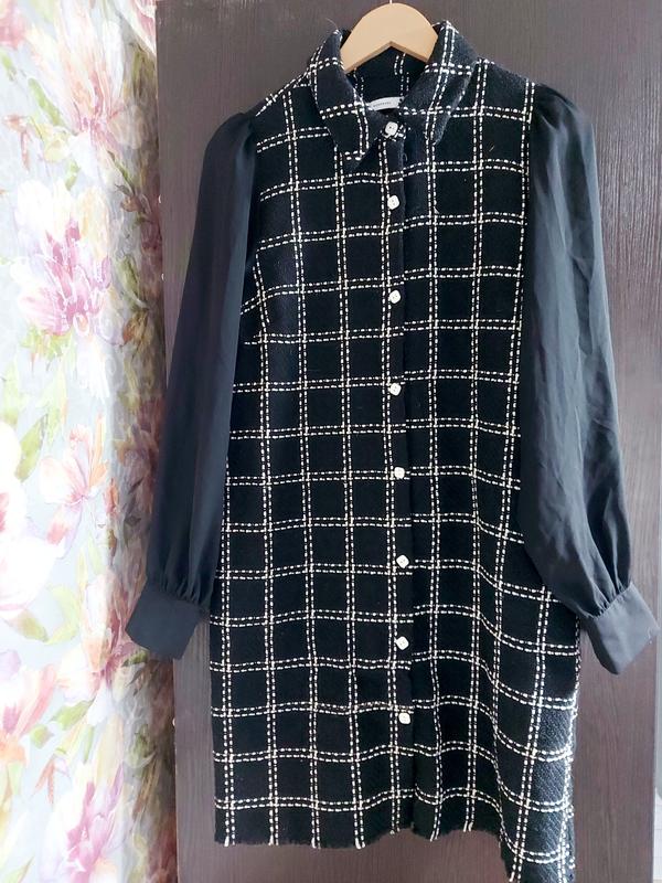 Платье рубашка в стиле Шанель с шифоновыми рукавами от Reserved. Размер L, лучше на М. Ширина плеч по швам 36см, между подмышками 50см, по талии и по низу 50см. Длина по застежке 82см, от подмышки книзу 66см. Длина рукава от плечевого шва 56см + 7см манжет, от подмышки 42см +7см. Ширина манжета 10см. Выполнена из ткани «рогожка», имеет необработанный низ, рукава из шифона. Есть петельки для пояса, можно поставить свой любимый. Отправлю по почте по полной предоплате или с Безопасной оплатой.