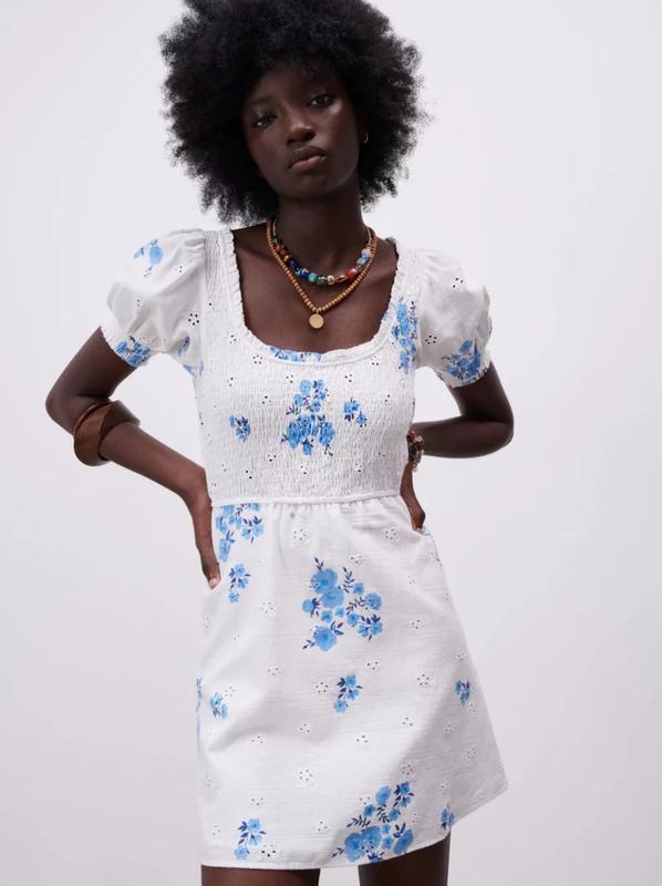 Хлопковое платье прошва от Zara, размер S-M. В груди и талии на резинке. На юбке есть подкладка. Ног 39 см, нот 35 см, ноб 53 см, длина 80