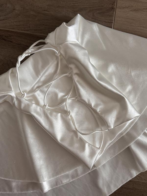 Атласна сукня кольору айворі в розмірі S. Дуже красива. Тканина щільна, не тонка, не просвічує і гарно тримає форму. Спинка гола на шнурівці.
