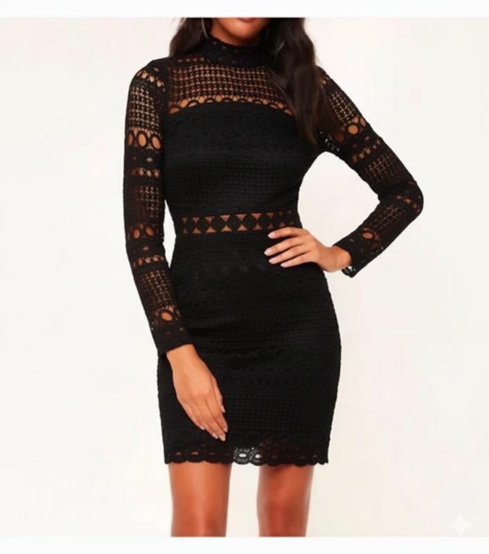 НОВА Волшебное черное кружевное платье с длинными рукавами I SAW IT FIRST. Приталенный силуэт, идеально подчеркивающий фигуру. Есть подкладка.Ззади на молнии.Ткань тянется. Размер 34 (XS) ПОС-42 см ПОТ-31 см Длина -86 см Воротник 4 см Рукав 61 см,от подмышки 48 см