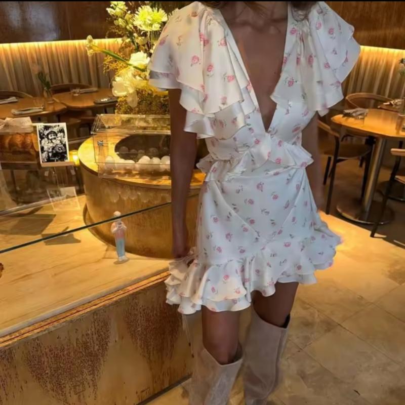 Элегантное цветочное платье с рюшами, v-образным вырезом и высокой талией.