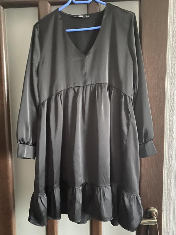 Атласное платье черного цвета. Размер М. Длина по спинке 88см. Рукав длинный на манжете.
