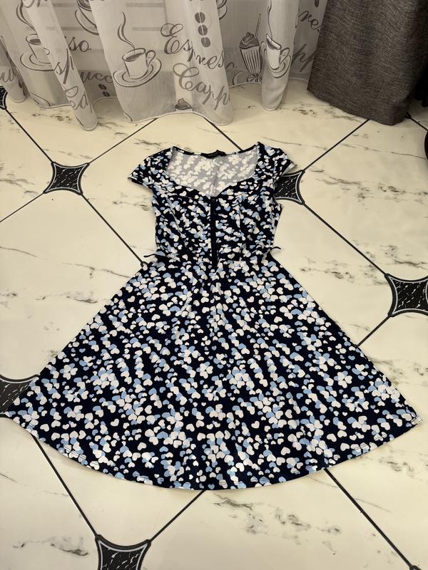 Котонова сукня в сердечки, в гарному стані без дефектів, розмір 8. Гарно ляже на XS-S. Тягнеться за рахунок еластану. Заміри виробу: напівобхват грудей 37 см, в талії 33 см, довжина 81 см
