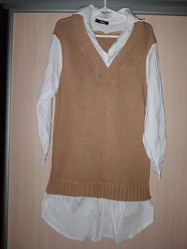 Платье-рубашка с жилеткой, прямого кроя Длина до конца жилетки 76 см, до конца рубашки 94 см Полуобхват груди 49 см Полуобхват груди можно потянуть до 54-55 см