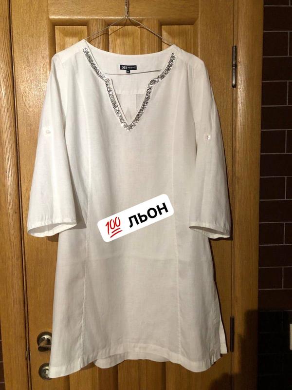 ВАЖЛИВО ‼️‼️‼️ Будь ласка, перед покупкою ознайомтеся з умовами співпраці і напишіть для уточнення всіх деталей. Дякую. Працюю: ☆безпечною оплатою відправляю тільки речі вартістю більше 1000 грн; ☆речі, вартістю менше 1000 грн відправляю через сайт тільки по повній передоплаті на карточку; ☆повернень немає; Виглядає бомбезно! Можна носити як сукню, можна як туніку під штанішки, можна і на пляж. Нічого зайвого, ніжний декор з леліток. 100% льон Зазначений розмір М Довжина 88 Рукав 45, можна регулювати Груди 108 Стегна 116 Бокові розрізи 23