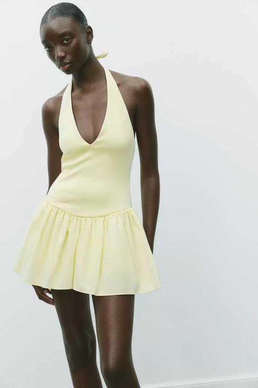 🔸 Коротка сукня з коміром хальтер, зав'язками та V-подібним вирізом. Низ з іншої тканини в тон. 🔸Колір: світло-жовтий (банановий) 🔸Розмір: L