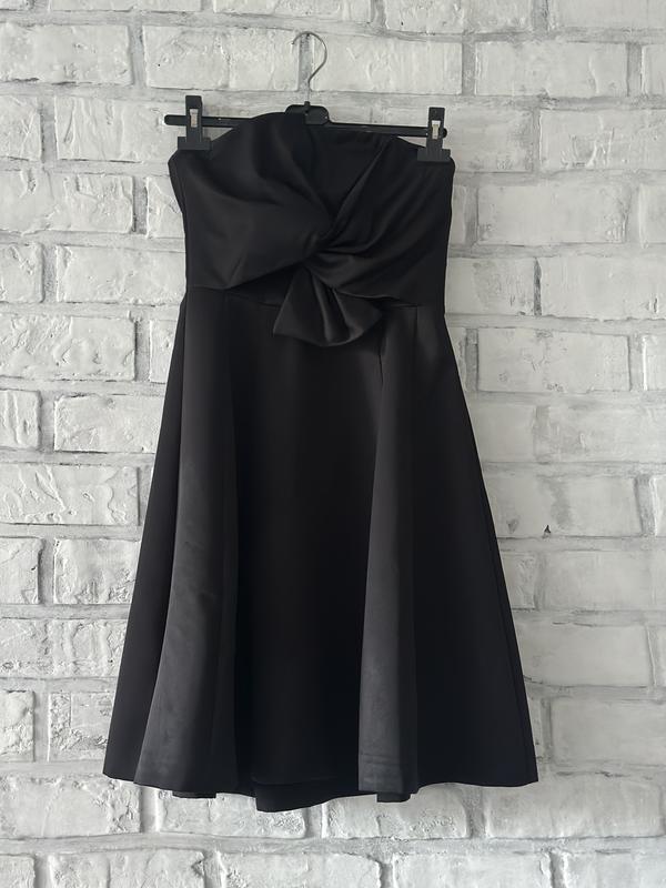 Коротка атласна сукня у стилі бандо з вузлом спереду та силіконовою обробкою зверху. Потайна блискавка позаду, шов на талії та круглі спідниці. Підкладка. Розмір- 38 Склад- поліестер Колір - чорний Заміри: Довжина- 83 см Груди- 38 см Талія- 48 ( на талії вже йде вільний крой) Низ- 109 см