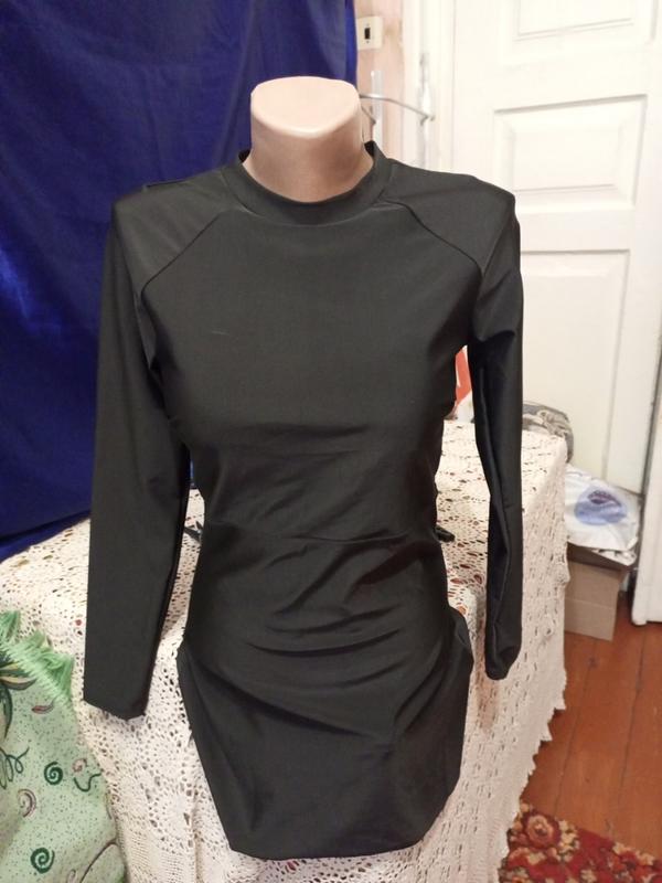 дуже гарна чорна коротка сукня. Тканина ластікові, добре обтягує і тримає форму. На груді є як топ,, з резинкою по низу, Кармакшинського і вставки. Розмір хс, с, м. опис стан отлічний довжина 79 рукав 58 ширина груді 40 ширина бедер 48