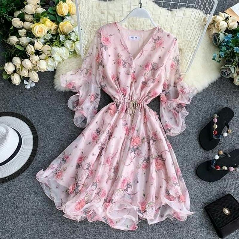 Летнее нежное шифоновое розовое платье цветочный принт с V-образным вырезом в элегантном стиле с летающими рукавами