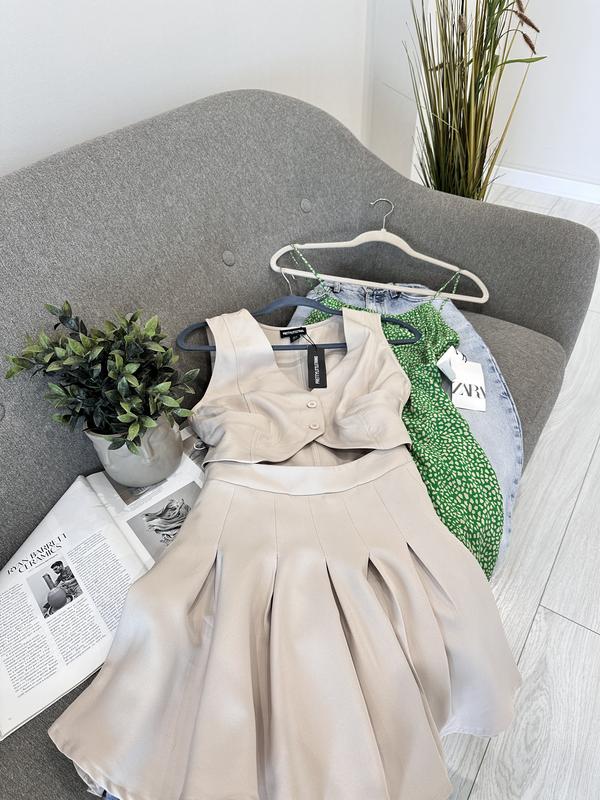 Елегантна сукня в ідеальному бежевому кольорі 👒 Імітація спідниці та жилету Вишукано та стильно 🔐 Стан нова Матеріал поліестр , ідеально тримає форму Розмір 38/10/М Груди 48 Талія 39 Бедра вільні 58 Довжина до талії 38 Довжина 84