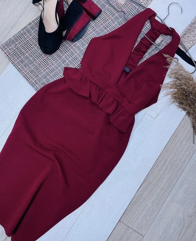 🍁бордова сукня з глибоким декольте та рюшами Розмір:XSСклад:95%поліестр,5%еластан Заміри(від шва до шва): Довжина 81 ПОГ (гумка) 38 тягнеться до 43 Півобхват талії 35 Півобхват стегон 40 По низу 34