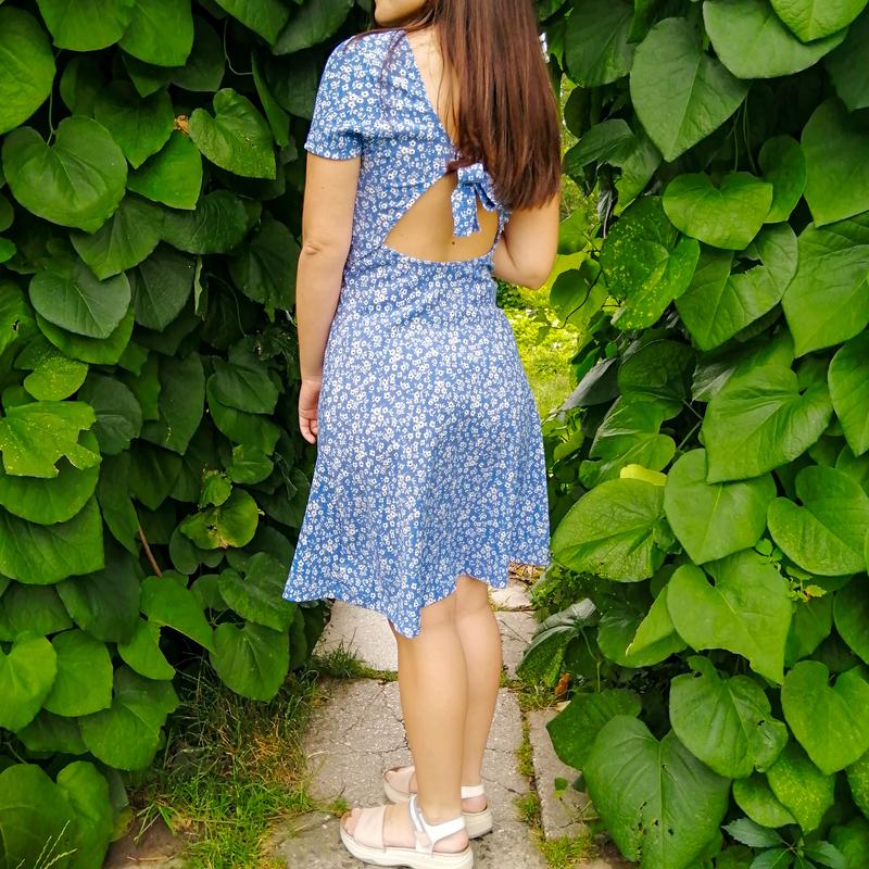 Летнее женское платье из легкого, приятного к телу ткани станет отличным выбором для теплых дней. Нежный голубой цвет с белым мелким цветочным принтом создает свежий и романтичный образ. Модель имеет приталенный силуэт, короткие рукава и круглый вырез, подчеркивающие женственность и утонченность фигуры. Также на спинке связывается бантик, создавая красивый вырез. Расклешенный низ добавляет легкости движениям, делая платье идеальным как для прогулок, так и для повседневной носки. Размер - М