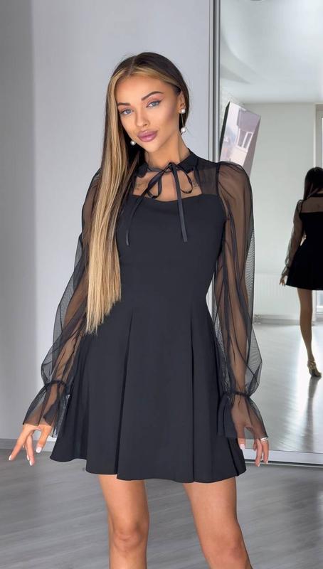 Сукня Мод #270 Тканина : креп дайвінг та сітка Розміри :42-44;46-48 Кольора : чорний Ціна :1100грн Вишукана та ніжна сукня з сіточки на рукавах - чудовий вибір на святкування свята ❤️ Приталений силует, обʼємні та прозорі рукава додасть твоєму образу романтичності та виразить твою фігуру