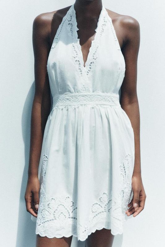 Короткое платье из 100%-го штапельного хлопка. С V-образным воротником хальтер, прорезной вышивкой в тон, подкладкой и завязками на шее. РАЗМЕР М: ✅ НОГ - 46 см ✅ НОТ -36 см ✅ НОБ -60 см ✅ Длина - 82 см ✅Состав: 100% хлопок,