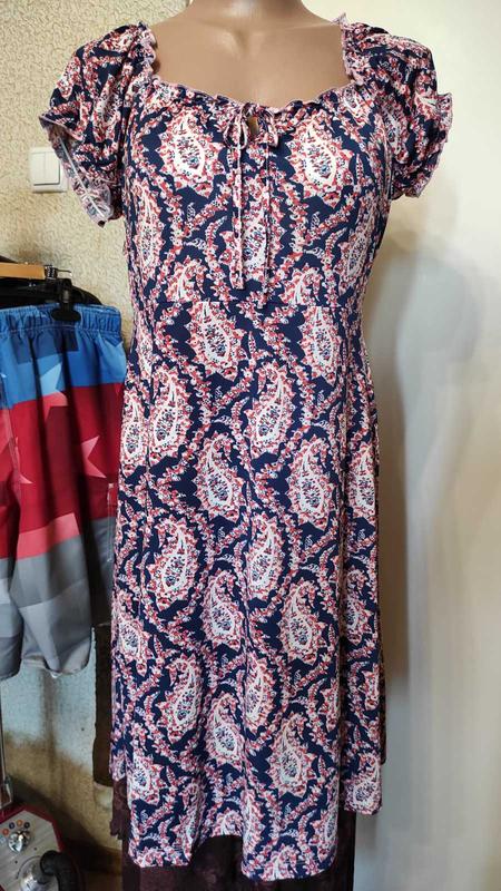 Чудове платтячко з приємного тоненького трикотажу. Добре тягнеться. Відрізне по таліі. ЗАМІРИ: Груди 50. Талія 42. Бедра 56. Довжина 95. Виріз 17