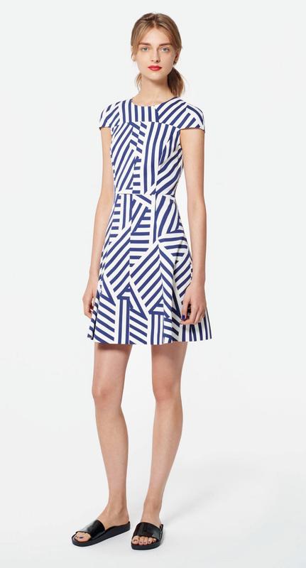 Стильное летнее платье в геометрический принт от премиум бренда Max & Co (Max Mara), cotton, S. темно-синяя с белым полоска, юбка 8 клинка, расклешенная к низу, выше колен, приталенная, молния сзади, оригинальный крой сверху, плечи реглан переходят в небольшой рукавчик, верх облегает по фигуре. Материал качественный коттон + немного эластана.