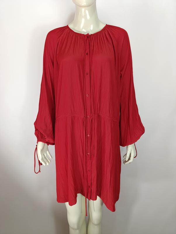 В отличном состоянии , фирменное платье-туника свободного кроя , на пуговицах , на завязках , которые затягивают рукава и талию , подойдёт на размер S-M-L , цвет терракотово-красный , с карманами . ПОГ 57 см , ПОТ 55 см затягивается , ПОБ 80 см , Длина рукава 55 см , Длина 87,5 см .
