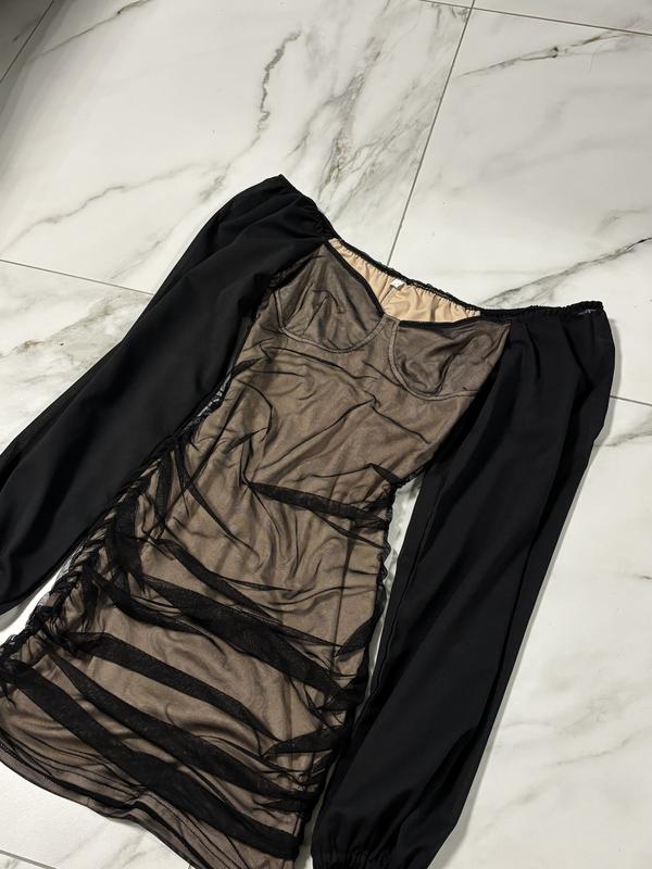 Елегантна жіноча вечірня сукня на підкладці з напівпрозорою сіткою. Має облягаючий крій, довгі рукави та ефектні драпування, які підкреслюють силует. • Колір: чорний з тілесною підкладкою • Розмір: S-M (універсальний) • Матеріал: сітка + підкладка Ідеально підходить для вечірок, святкових заходів чи особливих випадків.