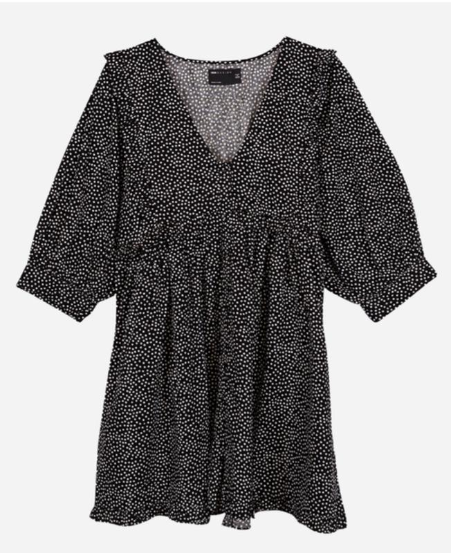 Классное женственное платье черное в мелкий белый горошек, до колена. Большие красивые рукавчики 3/4, спереди V-образный вырез, украшенная рюшечками спереди, сзади и внизу, пуговицы спереди на всю высоту платья + запасной. Размер М, UK10, EU38. Замеры: ПОГ 45 см ПОТ свободно 60 см ПОБ свободно 80 см Рукав 33×33 см объемный 100 % котон