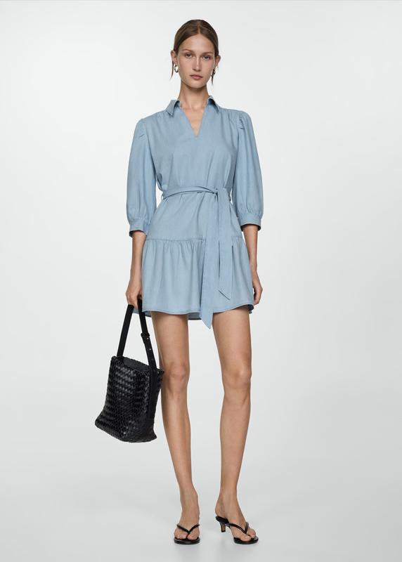 Короткий дизайн. А-лінія дизайн. Комір поло. Рукав три чверті. Петлі для ременя. Бант на талії. Зібрані деталі. 100% бавовняна тканина.