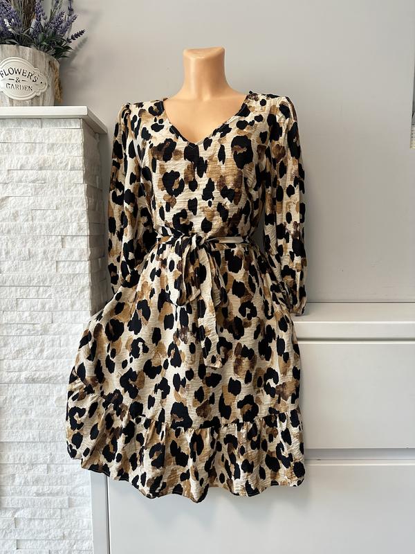 Сукня жіноча леопардового принта, розмір 12. Виконана з м’якої віскози, приємної до тіла. Має довжину 95 см, обхват грудей 52 см. Талія на зручній резинці та додатково підкреслюється поясом у тон. Рукави довгі з легким об’ємним ефектом і зібрані на манжеті. Спідниця з воланом, вільного крою по стегнах, що надає образу легкості та жіночності. Ідеальний варіант як для повсякденного носіння, так і для особливих виходів.