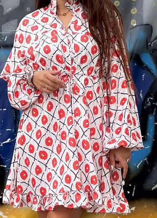 Жіноча сукня оздоблена актуальним принтом. Розкльошена спідниця, довгі пишні рукави ліхтарики на гумці, під грудьми на лаштунці. Високий комір, вільний крій зробить Ваш силует візуально стрункішим. розмір М в грудях вільного крою (летюча миш) Напівобхват по поясу 49 см(стягується до потрібних об'ємів) стегна вільного крою Довжина рукава від коміру 76 см Довжина виробу 88 см розмір L в грудях вільного крою (летюча миш) Напівобхват по поясу 50 см(стягується до потрібних об'ємів) стегна вільного крою Довжина рукава від коміру 76 см Довжина виробу 88 см