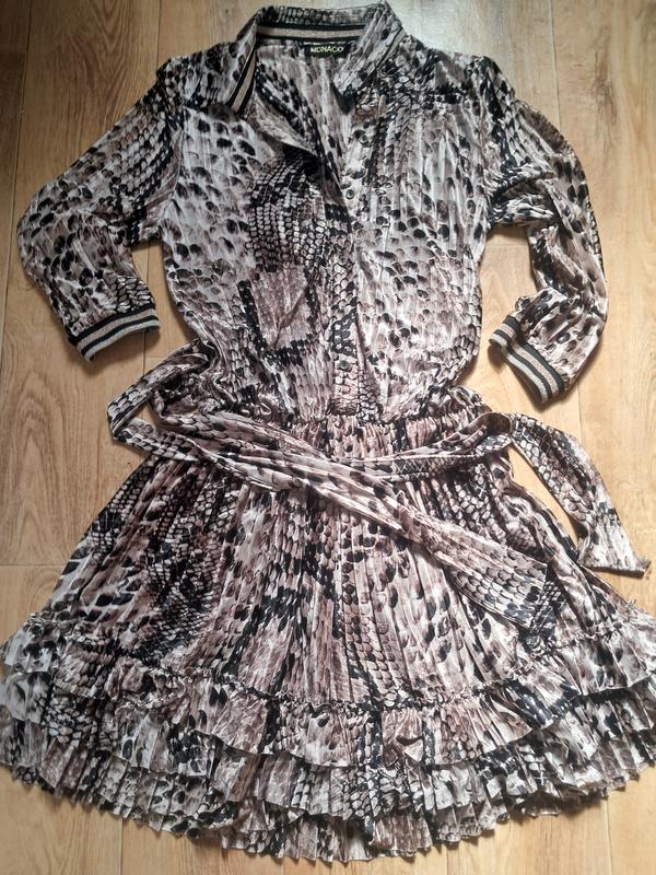 Красивое платье, в идеальном состоянии, рукав 3/4, на талии встроченная резинка, ткань напоминает "масло", размер 40-48, красиво на теле, принт "смейка".