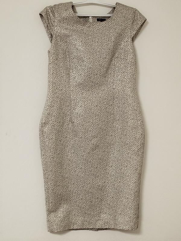 Размер 12, длина 99, полуобхват груди 46 полуобхват талии 40, полуобхват бедер 50. Тканина не тягнеться. Есть подкладка. На спине застежка молния.