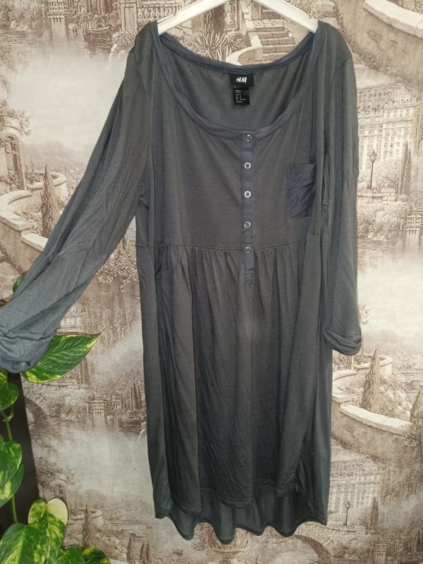 Продаётся струящееся серое платье-туника "H&M" Размер: М Передняя застёжка на кнопках. Рукава 3/4 с декоративными манжетами и кнопкой. Маленький карман спереди. Увеличенная длина сзади (82 см) по сравнению с 72 см спереди 100% вискоза