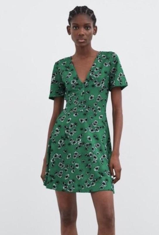 Жіноча літня сукня Zara зеленого кольору з квітами Дуже класний фасон Тканина дуже схожа на жатку, легка та приємна до тіла Розмір S Довжина - 85 см Напів об’єм грудей - 40 см Напів об’єм талії - 36 см Напів об’єм стегон - 52 см