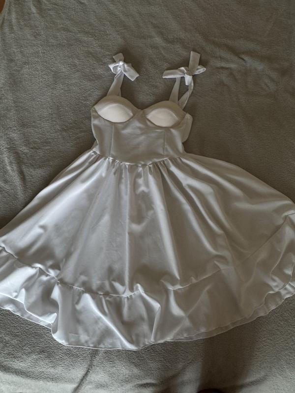 Біла літня сукня з бантиками на плечах, зроблена з легкої тканини , яка трохи просвічується . Чашки невеликого розміру . Стан ідеальний , не носилось жодного разу. Підійде на зріст 160-170 см . Лямки регулюються