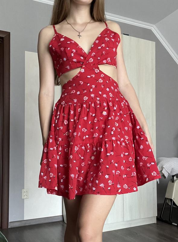 Легка червона сукня в квіточку. На завʼязках. Регульовані бретелі. Хоч на бірці зазначено розмір XS, сукня йде на S (трохи більшомірить).