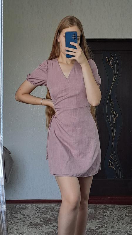 Платье мини, завязывается на запах, отлично подойдет на разный рост, можно регулировать в талии, ткань очень приятная на ощупь.