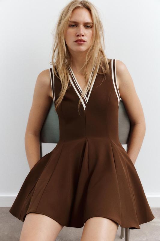Короткое облегающее платье-безрукавка с v-образным воротником и контрастной окантовкой в рубчик. Прорезные карманы по бокам. Крой в стиле годе внизу.Карамельный | 2180/307/732