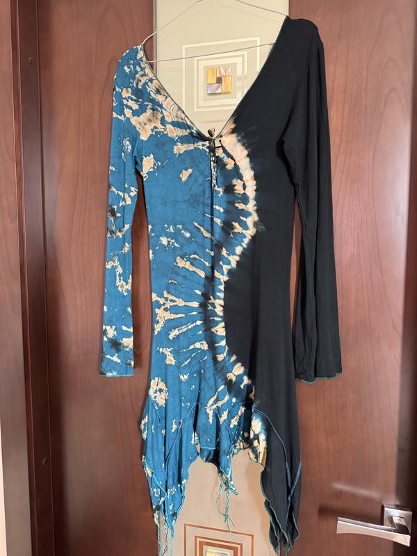 Цікава сукня з натуральної тканини, трикотаж, 100% район, тягнеться. Стан нової речі, з етикеткою. Дуже гарні китиці на подолі. Підійде для танців , тематичних вечірок. Гарно підкреслює фігуру. Розмір S. Довжина по самому короткому краю - 80 см. ПОГ - 40 см. Пот- 36 см. ПОС - 46 см. Тканина тягнеться.