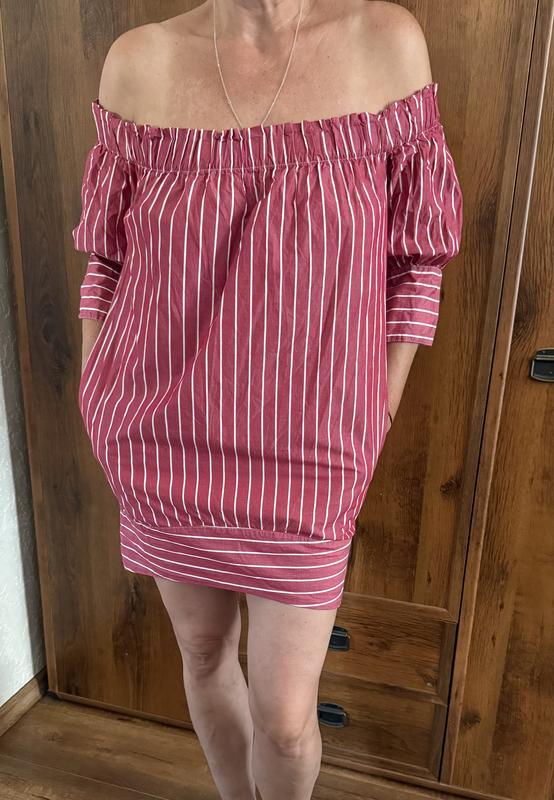 Стильное платье, открытая линия плеча , свободный крой чуть заужен низ , карманы !