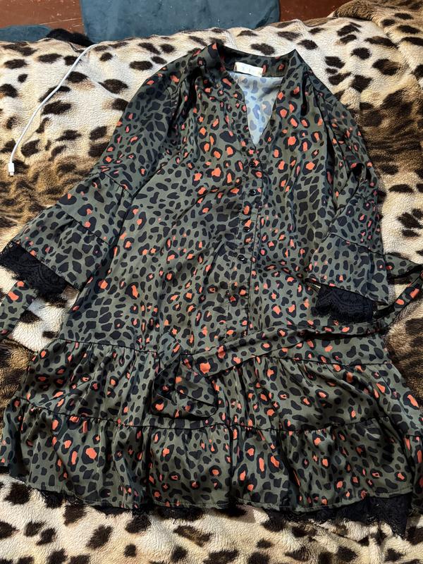 ✨ Стильне плаття з леопардовим принтом і мереживом ✨ • Колір: темно зелений із чорним та червоним принтом ( в житті колір темно зелений , чим на фото ) • Фасон: вільний крій, довжина вище коліна, рукави з мереживом, пояс у комплекті • Матеріал: легка струмлива тканина (поліестер) • Розмір: S-M (підійде на 36-38) • Стан: стан ідеальний , без дефектів • Ідеальний вибір для побачення, вечірки чи стильного повсякденного образу