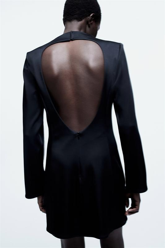 85% полиэстер, 13% вискоза, 2% эластан АТЛАСНАЯ СУКНЯ С ОТКРЫТОЮ Спиной. Короткое платье из мягко атласа с небольшим воротником-стойкой, потайными пуговицами сзади на горловине, подплечниками и длинными рукавами. Сзади вырез, закрывающийся на потайную молнию. Без подкладки. Ширина плеч 45см, длина рукава 66см, полуобхват груди 52см, длина изделия 88см.