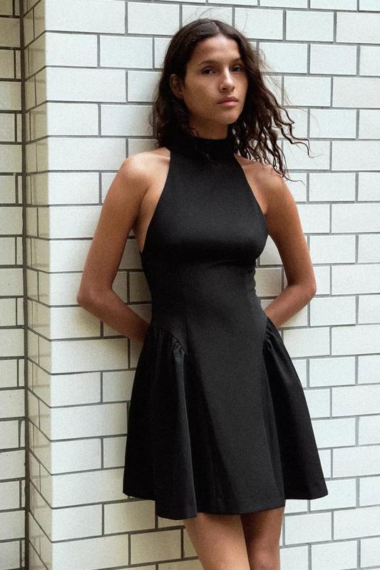 Коротка сукня з коміром-петлею та без рукавів. Деталь зі зборками. Комбінована внутрішня підкладка. Застібка на спині з потайною блискавкою в шві. ЧОРНИЙ | 3067/255/800