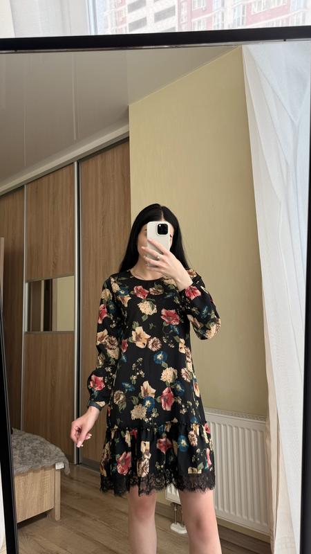 Стильна сукня міні з довгим рукавом Глибокий чорний фон із яскравим квітковим принтом М'яка талія та легкий клеш від стегон Поділ оздоблений ніжним мереживом Приємна до тіла тканина, добре сидить на фігурі 📏 Розмір: S (36)