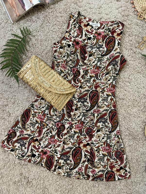 Нежное натуральное летнее платье в принт. Ткань тонкая, приятная, не просвечивается, не тянется. Крой по фигуре, юбка клеш. Застегивается на пуговицы. Сзади шнуровка. Состояние: идеальный. Эффекты: нет. Размер на бирке: 8 Замеры изделия: Плечи 29см. Высота проймы 21см. Полуобхват груди 42 см., Полуобхват талии 36 см., Полуобхват бедер 50см., Полуобхват низ 71см., длина по спине 78 см. длина от плеча 80 см. Состав ткани: 100% вискоза. Страна производитель: Китай. Бренд: Glamorous.