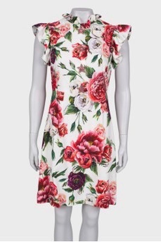 Сукня з шовкової тканини На підкладці Оздоблення- рюши та ґудзики- брошки Ширина плечей 35-36 Обхват грудей 90-94 Обхват талії 72-74 Обхват стегон- вільно Довжина 90