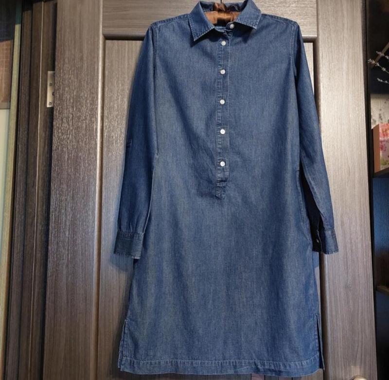Коттоновое платье прямого кроя рубашечного типа в джинсовом цвете от Uniqlo p.S Имеет боковые карманы и разрезы по низу по обе стороны С внутренней стороны рукавов есть пуговицы, рукава можно подвернуть Общее состояние идеальное, кроме маленькой зацепки на рукаве (см.фото) длина 87 пог 47 пот 45-46 поб 48 рукав от плеча 58 плечи 37