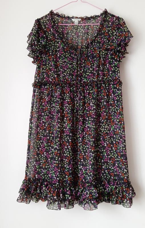 Легкая женская мини-платье/туника из полупрозрачного шифона с набивным рисунком на черном фоне.Сукня с завышенной талией имеет присборенную юбку, украшенная по низу рюшей и мелкими оборочками,рукав - крылышко,глубоккий вырез по лифу и завязка на горловины.,в боковом шве - замтежка молния.Стан идеален. Замеры длина -87см, длина рукавчика-11 см, ширина груди-49см., ширина плечей -38см. Состав: 100% полиэстер.