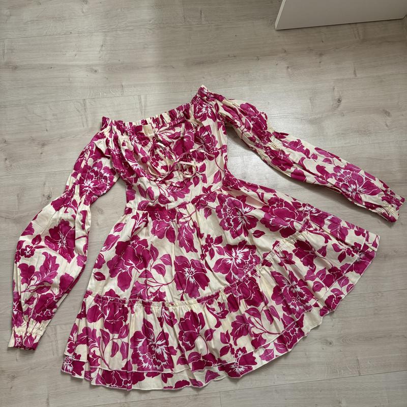 Шикарна жіноча сукня з пишною юбкою від Goldi колір молочний в малинових квітах,розмір S підійде також на xs ,дуже якісна тканина реклами не потребує )