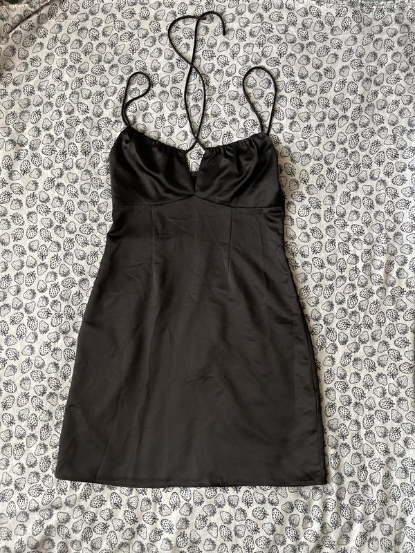 Маленька чорна сукня з цікавим акцентом на грудях. Бретельки розтягуються але не регулюються. Заміри: Довжина від початку чашки - 65см Напів обхват талії - 34см Напів обхват бедра - 44см Розмір S.